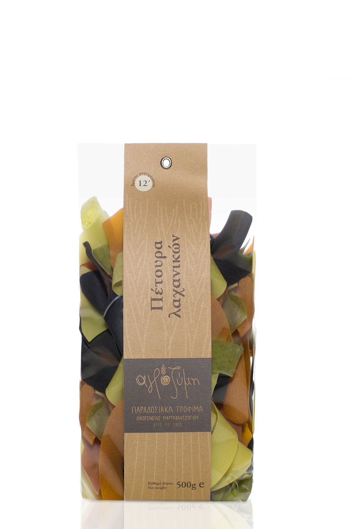 Συστατικά: Σιμιγδάλι σκληρού σίτου, αφυδατωμένα λαχανικά (σπανάκι, παντζάρι), κόκκινο πιπέρι, παστεριωμένο μελάνι σουπιάς 1%.
